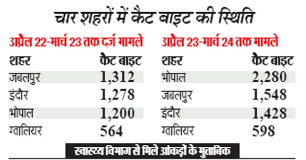 जबकि, गत वर्ष जबलपुर पहले पायदान पर था। वेटरनरी कॉलेज के प्रोफेसर एंड हेड मेडिसिन विभाग प्रो. डॉ. देवेन्द्र गुप्ता ने बताया कि डॉग लवर्स की तरह अब बिल्लियों को पालने का शौक लोगों में पिछले कुछ वर्षों में बढ़ा है। कैट के नाखून की खरोंच से भी बीमार होने का खतरा होता है। यदि टीकाकरण नहीं हुआ है तो बिल्ली के लार में रैबीज वायरस होने की आशंका ज्यादा होती है। टीकाकरण होने पर इसकी संभावना बहुत कम होती है।