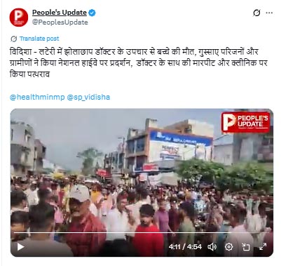 जानकारी के मुताबिक, बुधवार रात लटेरी स्थित सांई कृपा क्लीनिक में एक दो वर्षीय बीमार बच्चे को इलाज के लिए लाया गया था। परिजनों का कहना है कि डॉक्टर संतोष साहू ने बच्चे का इलाज शुरू किया लेकिन कुछ घंटों बाद ही बच्चे की हालत बिगड़ गई और उसकी मौत हो गई। मौत की खबर मिलते ही परिजनों का गुस्सा फूट पड़ा। उन्होंने क्लीनिक पर लापरवाही का आरोप लगाते हुए प्रदर्शन शुरू कर दिया।