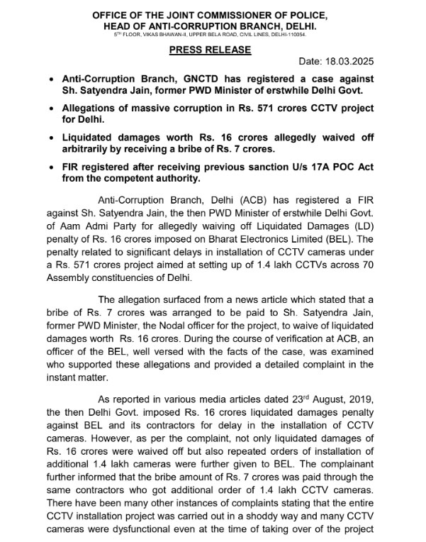 दिल्ली में आम आदमी पार्टी (AAP) सरकार के दौरान PWD मंत्री रहे सत्येंद्र जैन पर भ्रष्टाचार के गंभीर आरोप लगे हैं। Anti-Corruption Branch (ACB) ने उनके खिलाफ FIR दर्ज कर ली है। आरोप है कि उन्होंने 571 करोड़ रुपए के CCTV प्रोजेक्ट में 16 करोड़ रुपए के जुर्माने को माफ करने के बदले 7 करोड़ रुपए की रिश्वत ली।