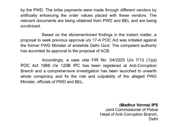 सत्येंद्र जैन दिल्ली सरकार में मंत्री थे, इसलिए ACB को पहले सरकारी मंजूरी (Section 17-A, POC Act) लेनी पड़ी। मंजूरी मिलने के बाद FIR नंबर 04/2025 दर्ज कर ली गई। सत्येंद्र जैन पर भ्रष्टाचार निवारण अधिनियम, 1988 की धारा 7 और 13(1)(a) और भारतीय दंड संहिता (IPC) की धारा 120B के तहत मामला दर्ज किया गया है।