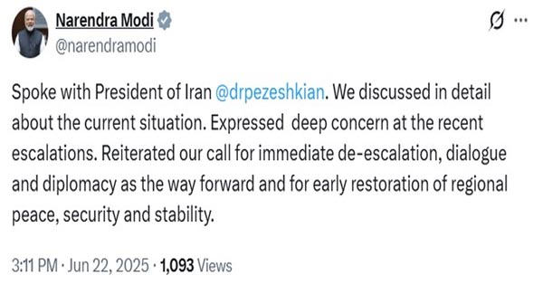 प्रधानमंत्री मोदी ने सोमवार को एक्स पर एक पोस्ट साझा कर यह जानकारी दी कि उन्होंने राष्ट्रपति पेजेशकियन से चर्चा की है। उन्होंने लिखा कि भारत इस संवेदनशील समय में सभी पक्षों से अपेक्षा करता है कि वे कूटनीति और संवाद का रास्ता अपनाएं ताकि क्षेत्रीय शांति और स्थिरता को खतरे में डालने वाली किसी भी स्थिति से बचा जा सके। पीएम मोदी ने दोहराया कि भारत का हमेशा यह मानना रहा है कि हर संघर्ष का समाधान बातचीत और शांति के जरिए ही संभव है।