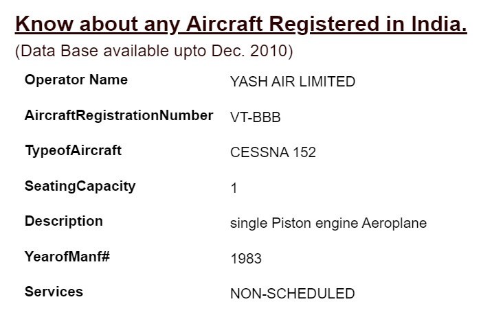 इस प्लेन का रजिस्ट्रेशन नंबर VT-BBB है और यह यश एयर लिमिटेड नाम की कंपनी के नाम पर रजिस्टर्ड है। यह एक सिंगल इंजन वाला सेसना-152 विमान है, जो 1983 में निर्मित है। इस विमान में केवल दो ही सीटें थीं। जिसे पायलट और को- पायलट उड़ा रहे थे। इस तरह के विमान का उपयोग प्रशिक्षण के लिए किया जाता है। फिलहाल पुलिस और प्रशासन ने जाकर दुर्घटना वाले इलाके को सील कर दिया है। नियम के मुताबिक डीजीसीए की टीम अब आकर इस प्लेन क्रैश की जांच करेगी।