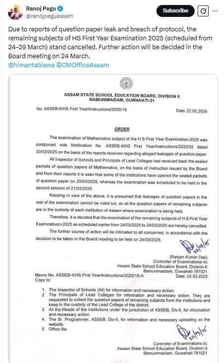 असम के शिक्षा मंत्री रनोज पेगू ने जानकारी दी कि राज्य भर में विभिन्न स्थानों पर प्रश्न पत्र लीक होने की खबरों के बाद यह फैसला लिया गया है। यह पहला मामला नहीं है, इससे पहले भी 21 मार्च 2025 को असम राज्य स्कूल शिक्षा बोर्ड (ASSEB) की 11वीं कक्षा की गणित परीक्षा का पेपर लीक हुआ था, जिसके कारण परीक्षा रद्द करनी पड़ी थी।