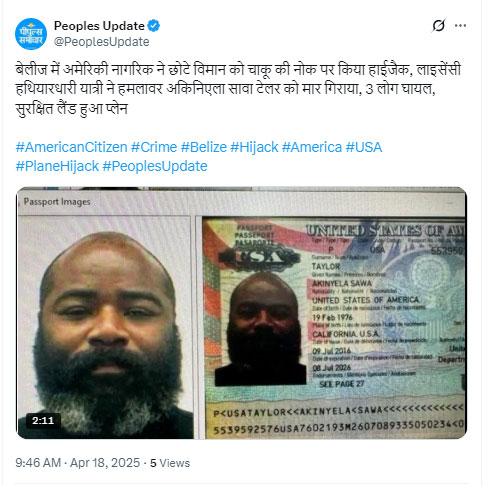 बेलीज। अमेरिका के बेलीज में एक अमेरिकी नागरिक अकिनिएला सावा टेलर ने ट्रॉपिक एयर बेलीज के एक छोटे विमान को चाकू दिखाकर हाईजैक कर लिया। विमान कोरोजल से सैन पेड्रो जा रहा था और इसमें कुल 14 यात्री सवार थे। टेलर ने हवा में चाकू निकालकर पायलट को धमकाया और विमान को देश से बाहर ले जाने के लिए मजबूर किया। साथ ही उसने अतिरिक्त ईंधन की भी मांग की।