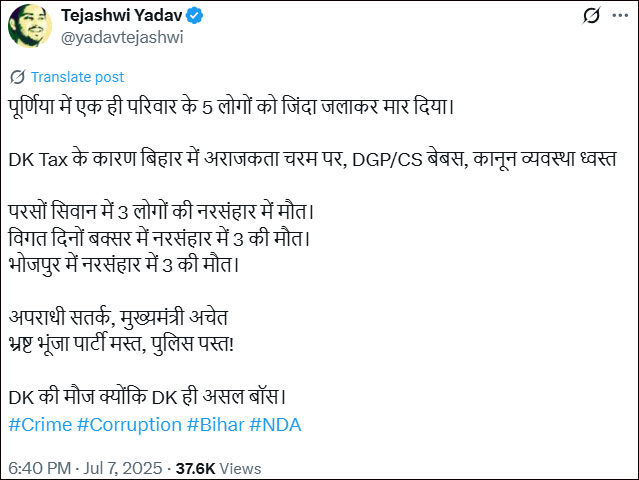 घटना पर राजद नेता तेजस्वी यादव ने राज्य सरकार को घेरा। उन्होंने लिखा – पूर्णिया में 5 लोगों को जिंदा जलाकर मार दिया गया। सिवान, बक्सर, भोजपुर – हर जगह नरसंहार हो रहे हैं। अपराधी सतर्क, मुख्यमंत्री अचेत।