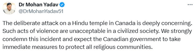 सीएम डॉ. यादव ने देर रात इस मामले को लेकर एक्स पर पोस्ट शेयर करते हुए लिखा- कनाडा में एक हिंदू मंदिर पर जानबूझकर किया गया हमला चिंतित करने वाला है। एक सभ्य समाज में इस प्रकार की हिंसक घटनाएं अस्वीकार्य हैं। हम इसकी कठोर निंदा करते है। कनाडा सरकार से अपेक्षा है कि वो सभी धर्मों के हितों की रक्षा के लिए तत्काल कदम उठाए।