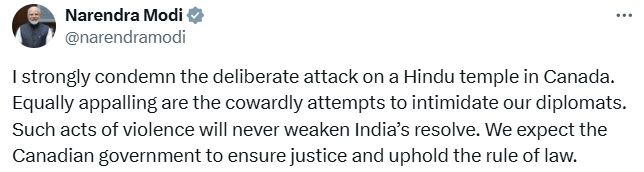 कनाडा में हिंदू मंदिर पर हमले की प्रधानमंत्री नरेंद्र मोदी ने निंदा की, उन्होंने एक्स पर पोस्ट शेयर कर लिखा- मैं कनाडा में एक हिंदू मंदिर पर जानबूझकर किए गए हमले की कड़ी निंदा करता हूं, हमारे राजनयिकों को डराने-धमकाने की कायरतापूर्ण कोशिशें भी उतनी ही भयावह हैं। हिंसा के ऐसे कृत्य कभी भी भारत के संकल्प को कमजोर नहीं करेंगे। हम कनाडा सरकार से न्याय सुनिश्चित करने और कानून के शासन को बनाए रखने की उम्मीद करते हैं।