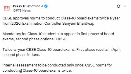 CBSE ने स्पष्ट किया है कि यह व्यवस्था फिलहाल केवल 10वीं कक्षा के लिए लागू होगी। 12वीं कक्षा की परीक्षा अभी साल में एक बार ही ली जाएगी।