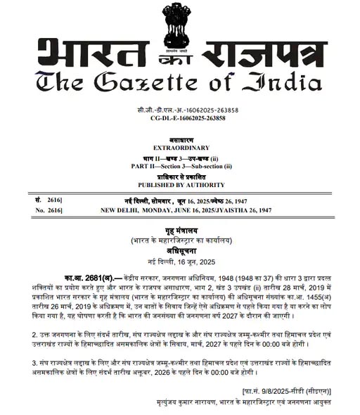 नई दिल्ली। केंद्र सरकार ने बहुप्रतीक्षित जातीय जनगणना को लेकर नोटिफिकेशन जारी कर दिया है। गृह मंत्रालय की ओर से सोमवार को जारी अधिसूचना के मुताबिक यह जनगणना दो चरणों में आयोजित की जाएगी। पहला चरण 1 अक्टूबर 2026 से शुरू होगा, जबकि दूसरा चरण 1 मार्च 2027 से शुरू किया जाएगा। यह जनगणना आजादी के बाद देश की पहली जातिगत जनगणना होगी, जिसे मूल जनगणना के साथ जोड़ा गया है।