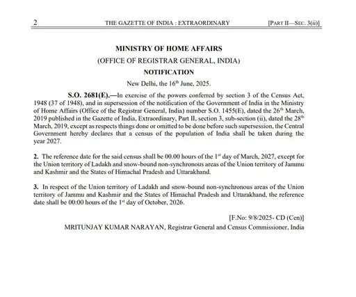 बाकी राज्यों में 1 मार्च 2027 से जनगणना