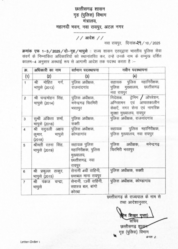 वरिष्ठ पुलिस अधीक्षक मोहित गर्ग को राजनांदगांव से DIG पुलिस मुख्यालय (मुख्यालय अटैच) किया गया। IPS चंद्रमोहन सिंह, जो पहले मनेंद्रगढ़-चिरमिरी-भरतपुर में SP थे, अब दमकल-नगर सेना के डायरेक्टर बनाए गए। SP अंकिता शर्मा को सक्ती जिले से राजनांदगांव का नया SP नियुक्त किया गया।