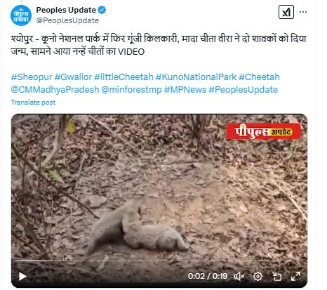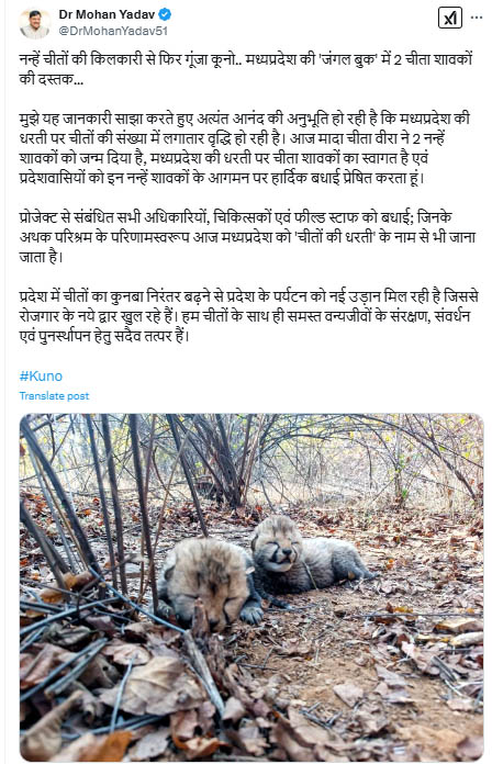 सीएम डॉ. मोहन यादव ने ‘एक्स' पर एक पोस्ट में कहा, “मध्य प्रदेश की ‘जंगल बुक' में दो चीता शावक शामिल हुए हैं। मुझे यह बताते हुए खुशी हो रही है कि मध्य प्रदेश की धरती पर चीतों की संख्या लगातार बढ़ रही है। आज मादा चीता वीरा ने दो शावकों को जन्म दिया है।” उन्होंने चीता परियोजना में शामिल अधिकारियों, चिकित्सकों और कर्मियों को बधाई देते हुए कहा कि उनके (अधिकारियों, चिकित्सकों और कर्मियों से) अथक परिश्रम के परिणामस्वरूप मध्यप्रदेश को ‘चीतों की भूमि' के रूप में भी जाना जाता है।