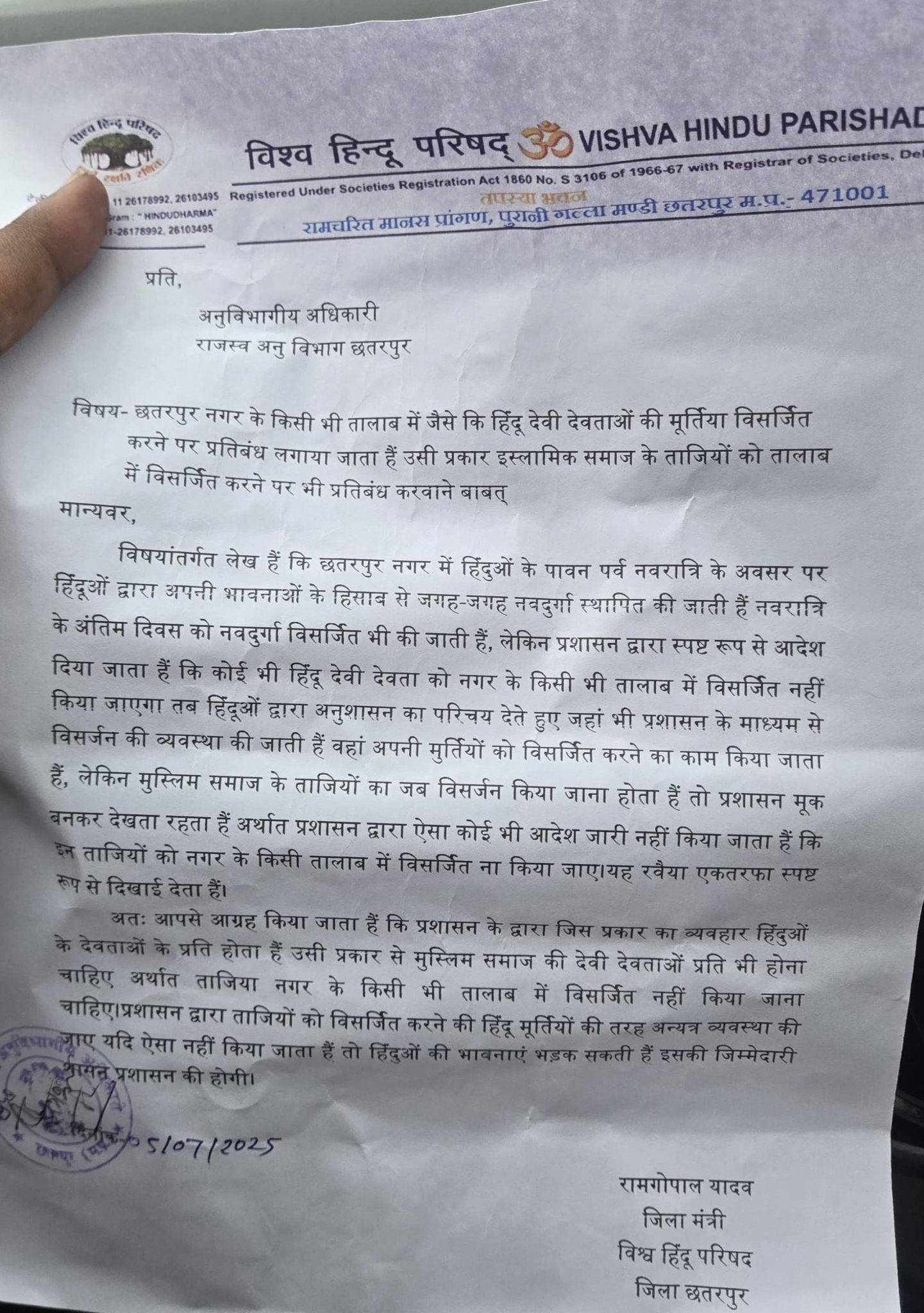 छतरपुर। मध्य प्रदेश के छतरपुर जिले में मुहर्रम से पहले माहौल गर्मा गया है। ताजिया जुलूस और विसर्जन को लेकर बजरंग दल ने ऐतराज जताते हुए प्रशासन के सामने नाराजगी जताई है। संगठन के कार्यकर्ता शनिवार को एसडीएम कार्यालय पहुंचे और ज्ञापन सौंपकर मांग की कि मुस्लिम समुदाय को ताजिया विसर्जन के लिए तालाबों के उपयोग की इजाजत न दी जाए।