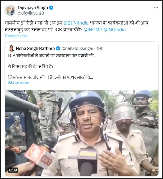 दिग्विजय सिंह ने सोशल मीडिया प्लेटफार्म 'X' पर रांची के SSP चंदन सिन्हा का वीडियो पोस्ट किया है। इसके साथ ही उन्होंने लिखा है- वीडी शर्मा जी अब इन भाजपा के कार्यकर्ताओं को भी आप नेस्तनाबूद कर उनके घर पर JCB चलवाएंगे?