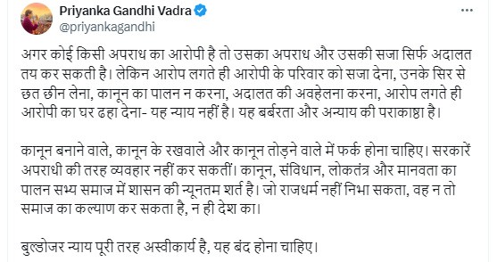 उन्होंने आगे कहा कि ''यह बर्बरता और अन्याय की पराकाष्ठा है। कानून बनाने वाले, कानून के रखवाले और कानून तोड़ने वाले में फर्क होना चाहिए। सरकारें अपराधी की तरह व्यवहार नहीं कर सकतीं। कानून, संविधान, लोकतंत्र और मानवता का पालन सभ्य समाज में शासन की न्यूनतम शर्त है। जो राजधर्म नहीं निभा सकता, वह न तो समाज का कल्याण कर सकता है, न ही देश का। बुल्डोजर न्याय पूरी तरह अस्वीकार्य है, यह बंद होना चाहिए।''