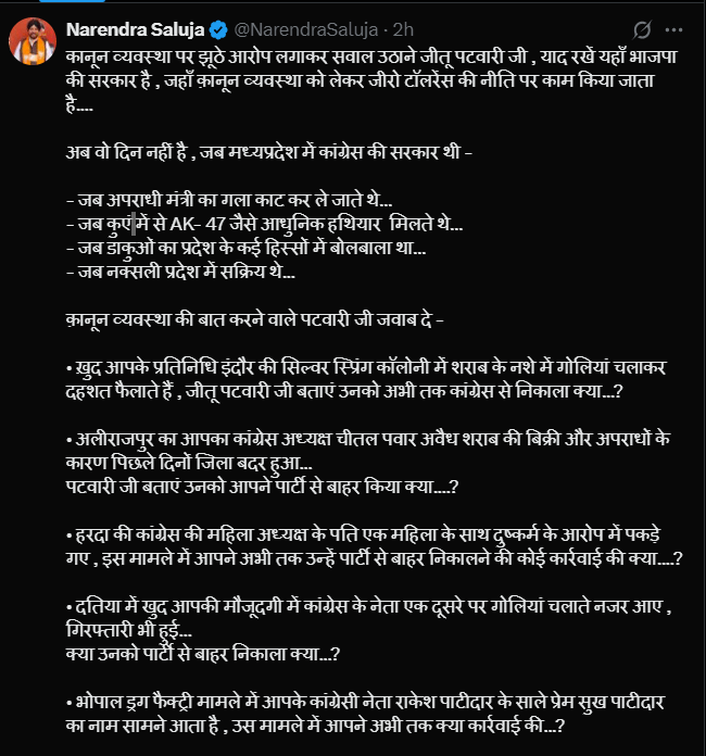 बीजेपी प्रवक्ता नरेंद्र सलूजा ने पटवारी के बयान पर पलटवार करते हुए कांग्रेस के शासनकाल में अपराधों की स्थिति की याद दिलाई। सलूजा ने ट्वीट किया, "वो दिन अब नहीं रहे जब मध्य प्रदेश में कांग्रेस की सरकार थी, जब अपराधी मंत्री का गला काट कर ले जाते थे और जब नक्सली सक्रिय थे। उन्होंने पूछा कि पटवारी खुद अपने पार्टी के नेताओं के खिलाफ क्या कार्रवाई कर रहे हैं, जिनके खिलाफ विभिन्न आपराधिक आरोप हैं।