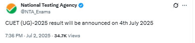 NTA ने अपने आधिकारिक सोशल मीडिया प्लेटफॉर्म ‘एक्स’ पर जानकारी दी कि परीक्षा का परिणाम 4 जुलाई 2025 को घोषित किया जाएगा। इसके बाद छात्र अपना रिजल्ट CUET की आधिकारिक वेबसाइट exam.nta.ac.in पर जाकर चेक कर सकेंगे।
