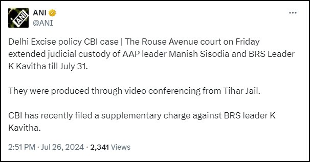 राउज एवेन्यू कोर्ट ने 22 जुलाई को के कविता के खिलाफ सीबीआई की ओर से दाखिल चार्जशीट पर संज्ञान लिया। आज उनकी न्यायिक हिरासत खत्म हो रही थी। कविता को सीबीआई ने इस मामले में 11 अप्रैल को गिरफ्तार किया था। सीबीआई ने के कविता के 7 जून को खिलाफ चार्जशीट दाखिल की थी।