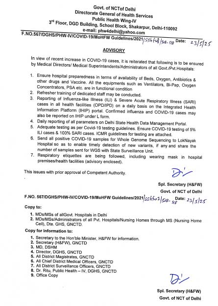 नई दिल्ली। देश में एक बार फिर कोरोना वायरस के मामलों में इजाफा देखने को मिल रहा है। ओमिक्रॉन के नए वैरिएंट JN.1 और उसके सब-वैरिएंट्स LF7 और NB1.8 को मौजूदा मामलों की वजह माना जा रहा है। इस स्थिति को देखते हुए दिल्ली सरकार ने शुक्रवार को एडवाइजरी जारी कर सभी अस्पतालों को सतर्क रहने और तैयारी पूरी रखने के निर्देश दिए हैं।
