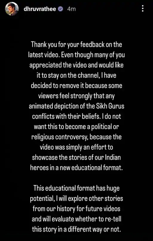विवाद के बढ़ने के बाद ध्रुव राठी ने एक वीडियो जारी कर कहा, “सिख समुदाय के कुछ लोगों का मानना है कि गुरुओं को एनिमेशन में दिखाना गलत है। मैं सभी से सोशल मीडिया पर प्रतिक्रिया मांगता हूं और यदि ज्यादा लोगों को इससे आपत्ति है तो मैं वीडियो डिलीट कर दूंगा या अन्य कदम उठाऊंगा।”