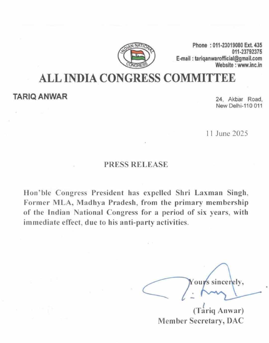 भोपाल। मध्य प्रदेश की राजनीति में उस वक्त हलचल मच गई जब कांग्रेस ने अपने वरिष्ठ नेता और पूर्व मुख्यमंत्री दिग्विजय सिंह के भाई लक्ष्मण सिंह को पार्टी से 6 साल के लिए निष्कासित कर दिया। पार्टी ने उनके हालिया विवादास्पद बयानों को गंभीर अनुशासनहीनता मानते हुए यह कड़ा कदम उठाया।