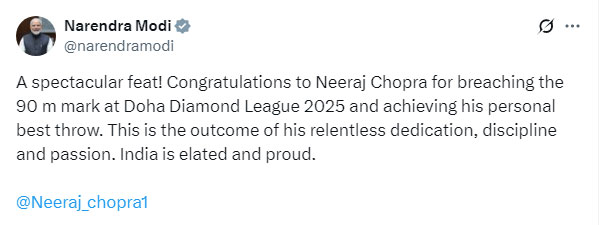 प्रधानमंत्री नरेंद्र मोदी ने भी नीरज के प्रदर्शन पर खुशी जताई। उन्होंने एक्स (पूर्व ट्विटर) पर लिखा, “वाह! नीरज चोपड़ा ने कर दिखाया। दोहा डायमंड लीग 2025 में 90 मीटर का आंकड़ा पार कर नीरज ने अपना ही रिकॉर्ड तोड़ा। ये उनकी कड़ी मेहनत, अनुशासन और जुनून का नतीजा है। पूरा देश जश्न मना रहा है, भारत को अपने सपूत पर गर्व है।”