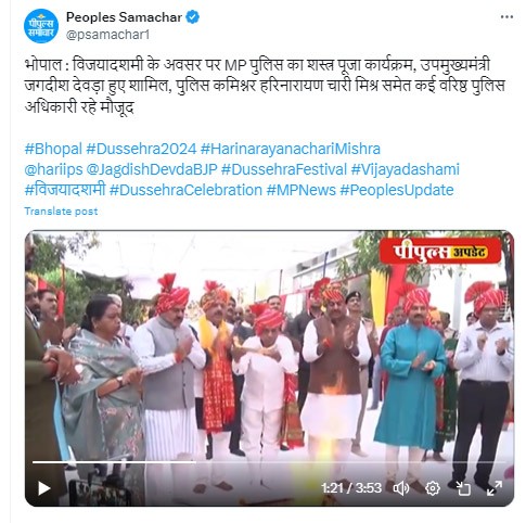 भोपाल में नेहरू नगर स्थित पुलिस लाइन में डिप्टी सीएम जगदीश देवड़ा, सांसद आलोक शर्मा, विधायक रामेश्वर शर्मा, मेयर मालती राय और पुलिस कमिश्नर हरि नारायणचारी मिश्रा ने शस्त्र पूजन किया।
