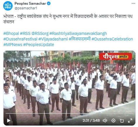 राष्ट्रीय स्वयंसेवक संघ ने सुभाष नगर में विजयादशमी के अवसर पर पथ संचलन निकाला। पथ संचालन विजयादशमी उत्सव पर असत्य पर सत्य की जीत का प्रतीक है। भगवान राम द्वारा जिस प्रकार समाज को संगठित कर स्वर्ण में लंका के स्वामी दशानन को परास्त किया था कि इस प्रकार से आज समाज संगठित हो एवं राष्ट्रपिता अपने परम वैभव को प्राप्त करें। मां भारती विश्व गुरु के सिंहासन पर अरुण हो ऐसी प्रतिज्ञा के साथ हम सभी पर संचालन में चले इसी अपेक्षा है।
