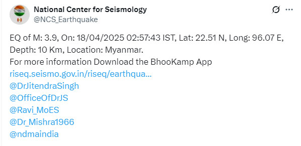 म्यांमार में भी भूकंप के झटके महसूस किए गए। वहां 3.9 और फिर 4.0 तीव्रता के दो झटके आए। भूकंप का केंद्र जमीन की सतह से केवल 10 किलोमीटर की गहराई पर था, जिससे लोग और ज्यादा डरे हुए हैं। हालांकि, वहां भी किसी बड़े नुकसान की सूचना नहीं है।