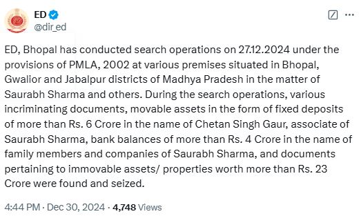 प्रवर्तन निदेशालय ने शुक्रवार को भोपाल, ग्वालियर और जबलपुर में सौरभ शर्मा और उसके सहयोगियों के ठिकानों पर छापेमारी की। यह तलाशी अभियान पीएमएलए 2002 के प्रावधानों के तहत किया गया। इस दौरान ईडी को सौरभ शर्मा के परिवार के सदस्यों और कंपनियों के नाम पर करोड़ों की चल-अचल संपत्ति से जुड़े दस्तावेज मिले, जिनमें से 23 करोड़ रुपए की संपत्ति और 4 करोड़ रुपए का बैंक बैलेंस जब्त किया गया है। सौरभ के सहयोगी चेतन सिंह गौर के नाम पर छह करोड़ रुपए की फिक्स डिपॉजिट और अन्य संपत्तियां भी मिली हैं।