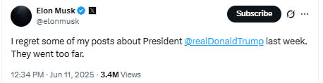 एलन मस्क ने X पर एक पोस्ट में लिखा- मुझे राष्ट्रपति डोनाल्ड ट्रंप पर पिछले हफ्ते किए गए कुछ पोस्ट के लिए खेद है। वे हद से आगे चले गए। यह बयान तब आया जब मस्क ने एक पोस्ट में दावा किया था कि 'मेरे बिना ट्रंप चुनाव हार जाते।'