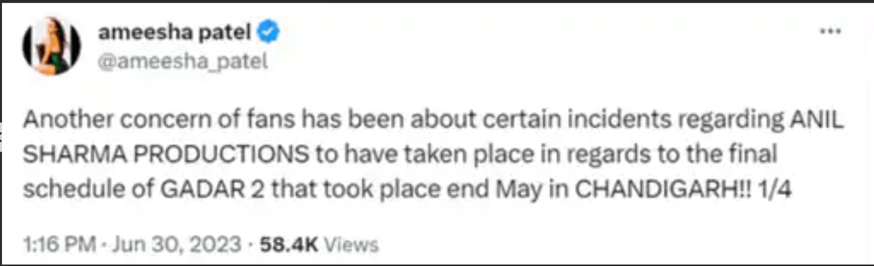 इसके साथ फिल्म रिलीज से कुछ ही दिन पहले, एक्ट्रेस ने अनिल शर्मा पर आरोप लगाए थे कि उन्होंने शूटिंग के दौरान क्रू मेंबर्स को पैसे नहीं दिए थे। इस मुद्दे पर उन्होंने सोशल मीडिया पर एक लंबी पोस्ट भी लिखी थी। इसके अलावा, अमीषा ने कई इंटरव्यू में यह भी कहा था कि गदर 2 की शूटिंग के दौरान उनके और अनिल शर्मा के बीच क्रिएटिव डिफरेंस के कारण बातचीत बंद हो गई थी।
