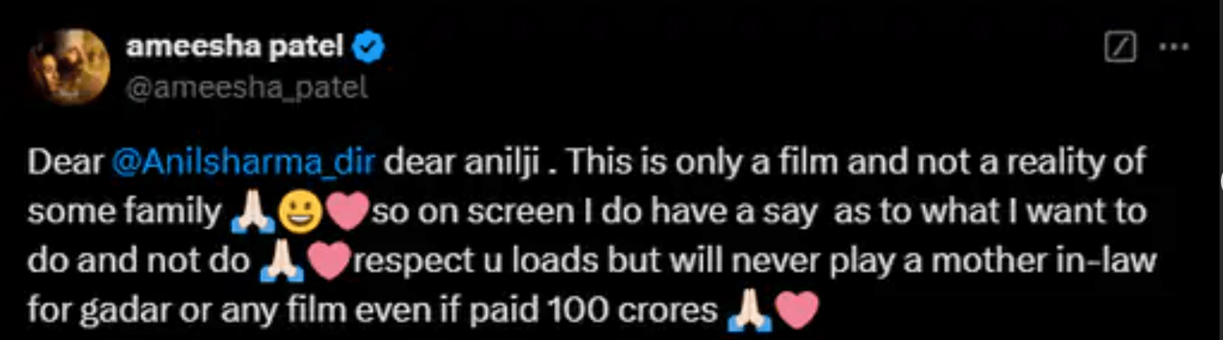 अमीषा ने अनिल शर्मा का इंटरव्यू X प्लेटफॉर्म पर री-पोस्ट करते हुए लिखा, ‘प्रिय अनिल जी, ये असल परिवारों की सच्चाई नहीं बल्कि सिर्फ एक फिल्म है। ऐसे में मुझे ये कहने का पूरा अधिकार है कि मुझे क्या करना है और क्या नहीं। आपकी इज्जत करती हूं, लेकिन अगर आप मुझे 100 करोड़ रुपए भी दें तब भी मैं गदर या किसी दूसरी फिल्म में कभी सास का रोल नहीं निभाऊंगी।’
