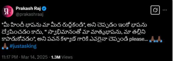 प्रकाश राज ने सोशल मीडिया पर पोस्ट करते हुए लिखा कि ‘हम पर हिंदी मत थोपो’ का मतलब दूसरी भाषा से नफरत करना नहीं, बल्कि अपनी मातृभाषा की रक्षा करना है। उन्होंने कहा कि कोई पवन कल्याण को यह समझाए कि यह सिर्फ अपनी भाषा के लिए गर्व महसूस करने की बात है।