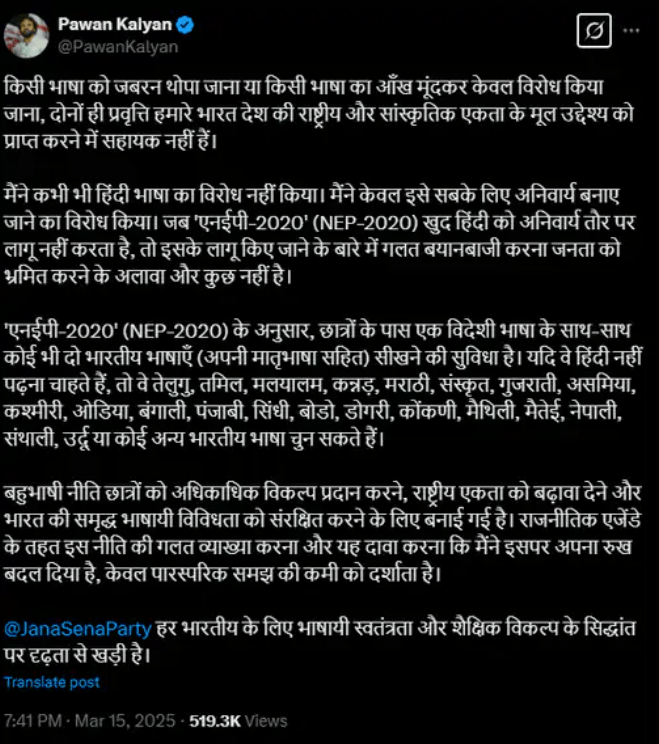 साउथ सुपरस्टार और तमिलनाडु के डिप्टी सीएम पवन कल्याण ने हाल ही में हिंदी भाषा का विरोध करने वाले नेताओं पर पलटवार किया था। उन्होंने कहा कि कुछ नेता हिंदी का विरोध करते हैं, लेकिन अपनी फिल्मों को हिंदी में डब करके बॉलीवुड से कमाई भी करते हैं। इसके बाद राजनीतिक बहस के साथ साथ पूरे साउथ में हलचल मच गई। इस बयान के बाद एक्टर प्रकाश राज ने भी उन पर हिंदी थोपने का आरोप लगाया, जिसके जवाब में पवन कल्याण ने अपनी सफाई पेश की।