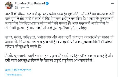 जीतू पटवारी ने एक्स हैंडल पर लिखा, "कटनी की वीभत्स घटना से पूरा मध्य प्रदेश स्तब्ध है। एक दलित मां- बेटे को भाजपा के वर्दी वाले गुंडों ने बंद कमरे में लाठी से पीट-पीट कर अर्धमृत कर दिया है। भाजपा के कुशासन में मध्य प्रदेश के दलित भयावह जीवन जीने को मजबूर हैं। अगर मुख्यमंत्री अपने प्रदेश के लोगों की सुरक्षा नहीं कर सकते तो उन्हे तुरंत इस्तीफ़ा दे देना चाहिए।"