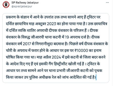 इस मामले पर कटनी जीआरपी टीआई अरुणा वाहने कुछ भी कहने को तैयार नहीं है। वहीं कटनी एसपी अभिजीत रंजन ने कहा कि वीडिया पुराना है। इसकी जांच एएसपी संतोष डेहरिया को सौंपी गई है। बीते वर्ष चोरी के आरोप में फरार दीपक वंशकार पर 10 हजार का इनाम रखा था। संभवत: इसी के चलते परिजनों को पूछताछ के लिए बुलाया गया है। जांच के बाद स्थिति स्पष्ट होगी। एसपी रेलवे को जानकारी दे दी गई है। वहीं एसपी रेलवे जबलपुर के अनुसार वीडियो अक्टूबर 2023 का होना पाया गया है। जिस निगरानीशुदा बदमाश के परिजन इस वीडियो में हैं उस पर 19 मामले दर्ज हैं। दोषी थाना प्रभारी को हटा जांच एएसपी रेल को सौंपी गई है।