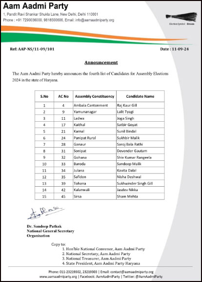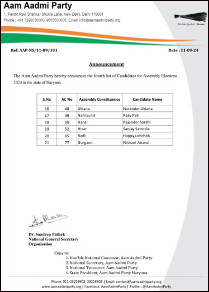 इसके अलावा बरौदा से संदीप मलिक, जुलाना से कविता दलाल, सफीदों से निशा देशवाल, तोहाना से सुखविंदर सिंह गिल, क्लानवाली से जसदेव निक्का, सिरसा से शाम मेहता, उकलाना से नरेंद्र उकलाना, नारनौद से राजीव पाली, हमसे से रजिंदर सोखी, हिसार से संजय सतरोदिया, बादली से हैप्पी लोचब और गुड़गांव से निशांत आनंद को उम्मीदवार बनाया गया है। गौरतलब है कि आप ने हरियाणा की 90 सीटों के लिए अभी तक 61 सीटों पर उम्मीदवार घोषित किए हैं।