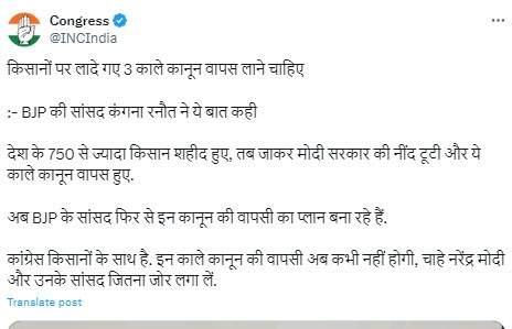 कांग्रेस पार्टी ने अपने ऑफिशियल एक्स हैंडल पर कंगना के बयान वाला वीडियो शेयर करते हुए लिखा, "किसानों पर लादे गए 3 काले कानून वापस लाने चाहिए। BJP की सांसद कंगना रनौत ने ये बात कही। देश के 750 से ज्यादा किसान शहीद हुए, तब जाकर मोदी सरकार की नींद टूटी और ये काले कानून वापस हुए। अब BJP के सांसद फिर से इन कानून की वापसी का प्लान बना रहे हैं। कांग्रेस किसानों के साथ है। इन काले कानून की वापसी अब कभी नहीं होगी, चाहे नरेंद्र मोदी और उनके सांसद जितना जोर लगा लें।"