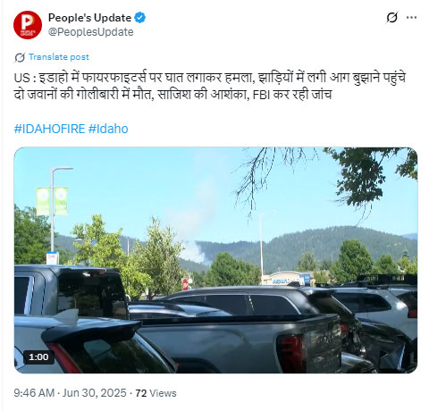 वॉशिंगटन। अमेरिका के इडाहो राज्य के कोयूर डी’अलने (Coeur d’Alene) इलाके में दो फायरफाइटर्स की घात लगाकर की गई गोलीबारी में मौत हो गई, जबकि एक गंभीर रूप से घायल है। ये सभी फायरफाइटर Canfield Mountain की पहाड़ियों में लगी आग को बुझाने के लिए पहुंचे थे। शुरुआती जांच में सामने आया है कि यह हमला सुनियोजित था और हमलावरों ने पहले आग लगाई, फिर मौके पर पहुंचे फायरकर्मियों पर अचानक गोलीबारी शुरू कर दी।