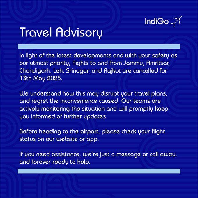 भारतीय विमानपत्तन प्राधिकरण (AAI) ने सोमवार को एक प्रेस रिलीज जारी कर जानकारी दी थी कि 15 मई तक बंद किए गए 32 एयरपोर्ट्स को अब फिर से नागरिक उड़ानों के लिए खोल दिया गया है। हालांकि, एअर इंडिया और इंडिगो ने 13 मई को कुछ संवेदनशील शहरों के लिए उड़ानों को रद्द करना ही बेहतर समझा।