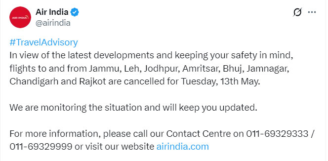 एअर इंडिया ने सोशल मीडिया प्लेटफॉर्म X पर जानकारी दी कि, यह फैसला हालात को देखते हुए और यात्रियों की सुरक्षा को प्राथमिकता देते हुए लिया गया है। पोस्ट में कहा गया, “हम स्थिति पर नजर बनाए हुए हैं और समय-समय पर अपडेट देते रहेंगे।” यात्रियों को सलाह दी गई है कि, वे एयरलाइन की वेबसाइट या हेल्पलाइन नंबर के जरिए अपनी फ्लाइट स्टेटस की जानकारी लें।