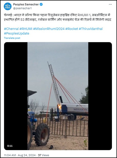 चेन्नई। भारत ने अपना पहला रियूजेबल हाइब्रिड रॉकेट RHUMI 1 लॉन्च किया है। चेन्नई के थिरुविदंधई से 24 अगस्त को मोबाइल लॉन्चर के जरिए रॉकेट की लॉन्चिंग हुई। हाइब्रिड रॉकेट को तमिलनाडु बेस्ड स्टार्ट-अप स्पेस जोन इंडिया ने मार्टिन ग्रुप के साथ मिलकर डेवलप किया है। इसके जरिए 3 क्यूब सैटेलाइट और 50 PICO सैटेलाइट को सफलतापूर्वक सबऑर्बिटल ट्रैजेक्टरी में स्थापित किया जाएगा।
