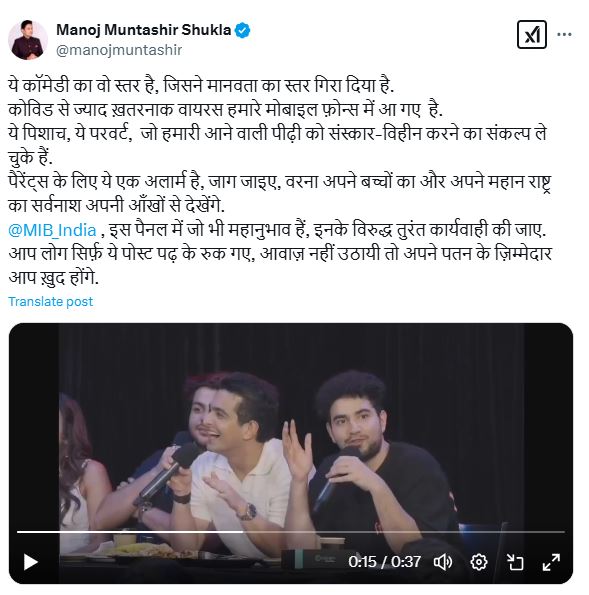इसके साथ ही गीतकार मनोज मुंतशिर ने भी शो के दौरान हुई इस घटना की निंदा की है। उन्होंने कहा कि ये कामेडी का वो स्तर है जिसने मानवता के स्तर को गिरा दिया। यह पैरेंट्स के लिए एक वॉर्निंग अलार्म है कि वो जाग जाएं। कोविड से भी खतरनाक वायरस हमारे फोन में आ चुके हैं।