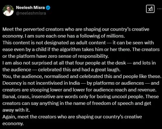 उन्होंने यह भी कहा कि ये क्रिएटर्स केवल व्यूअरशिप और कमाई के लिए अपनी मर्यादा से गिरते जा रहे हैं और अभिव्यक्ति की स्वतंत्रता के नाम पर कुछ भी कहकर बच जाते हैं।
