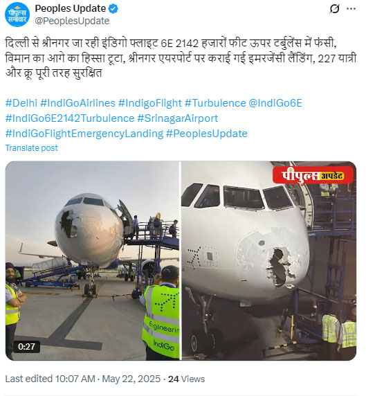 इंडिगो ने प्रेस रिलीज जारी करते हुए बताया, "दिल्ली से श्रीनगर जा रही फ्लाइट 6E 2142 को रास्ते में अचानक ओलावृष्टि का सामना करना पड़ा। विमान और केबिन क्रू ने तय नियमों के अनुसार कार्रवाई की और फ्लाइट की सुरक्षित लैंडिंग कराई गई। यात्रियों की सुविधा और आराम का एयरपोर्ट टीम ने पूरा ध्यान रखा।"