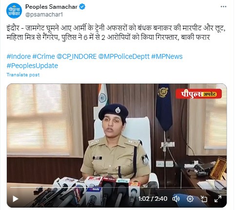 ये भी पढ़ें- इंदौर में शर्मनाक वारदात, आर्मी अफसरों से लूट, बदमाशों ने रुपए लाने भेजा, दूसरी तरफ महिला मित्र से किया गैंगरेप, SP बोलीं- पीड़िता के बयान होना बाकी