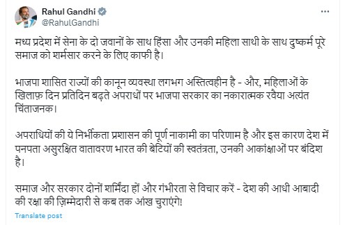 लोकसभा में नेता विपक्ष राहुल गांधी ने घटना पर दुख जाहिर किया। उन्होंने एक्स पर लिखा- मध्य प्रदेश में सेना के दो जवानों के साथ हिंसा और उनकी महिला साथी के साथ दुष्कर्म पूरे समाज को शर्मसार करने के लिए काफी है। भाजपा शासित राज्यों की कानून व्यवस्था लगभग अस्तित्वहीन है - और, महिलाओं के खिलाफ़ दिन प्रतिदिन बढ़ते अपराधों पर भाजपा सरकार का नकारात्मक रवैया अत्यंत चिंताजनक।