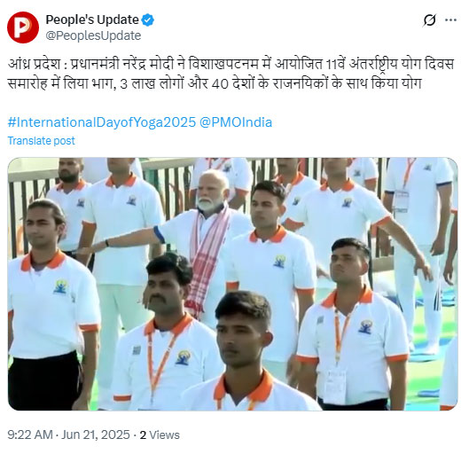 विशाखापट्टनम में हुए मुख्य आयोजन में आंध्र प्रदेश के मुख्यमंत्री चंद्रबाबू नायडू और डिप्टी सीएम पवन कल्याण ने पीएम मोदी के साथ योग किया। इसी आयोजन के तहत 50 लाख से अधिक योग प्रमाणपत्र वितरित किए गए और राज्य सरकार ने ‘योग आंध्र’ अभियान की शुरुआत की, जिसका लक्ष्य है कि 10 लाख लोगों की रोजाना योग करने वाली कम्युनिटी तैयार की जाए।