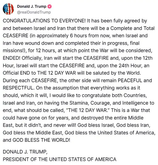 ट्रंप के मुताबिक, पहले 12 घंटे तक ईरान कोई हमला नहीं करेगा। अगले 12 घंटे तक इजराइल हथियार नहीं उठाएगा। ट्रंप ने इसे “12 दिवसीय युद्ध का अंत” बताते हुए मिडिल ईस्ट के लिए ऐतिहासिक दिन कहा। उन्होंने दोनों देशों की सहमति से शांति स्थापना का दावा किया।
